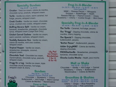 Welcome to Frogg's Ice Cream, a delightful gem nestled in Sherwood, Wisconsin. Renowned for its exceptional ice cream, this quaint outdoor stand evokes nostalgia with a charming froggy theme and kitschy decor. The menu features a variety of treats, including the crowd favorite, Frog on a Log, a decadent brownie, fudge, and ice cream sundae that boasts generous portions. Diners can enjoy classics like the Frogg-in-a-Blender, inspired by beloved blizzard-style desserts, alongside refreshing smoothies and sundaes.